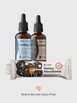 Rounding out the bundle is a 12-bar caddy of our all-natural energy bars, each packed with 2,500 mg of five different functional mushrooms. Because let's face it — even the simplest cognitive functions can become a challenge if you're hangry! Choose between the original Honey Walnut Pecan bar or the dairy-free Honey Macadamia Cashew bar. They're Umbo-licious!